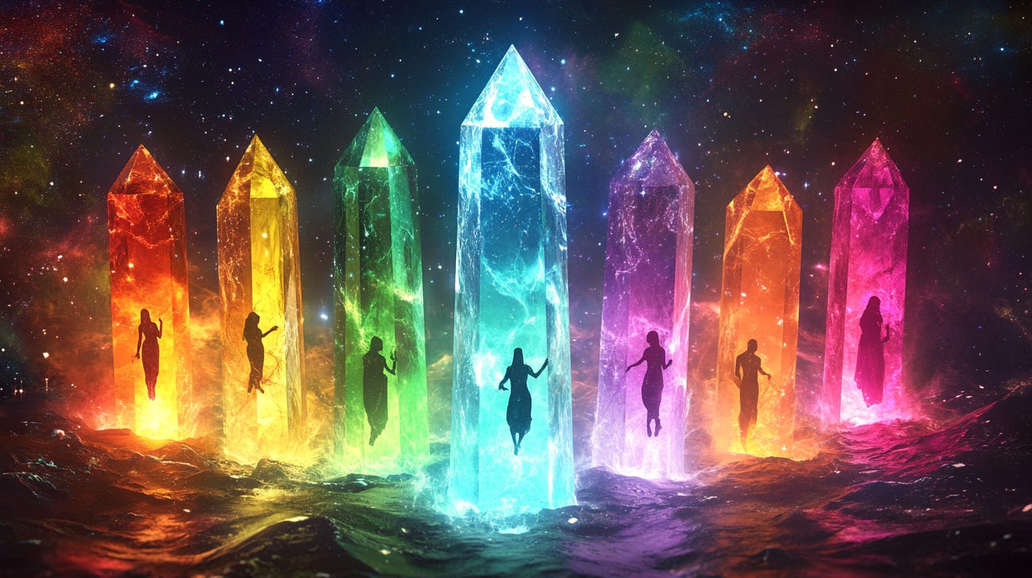 Imagine consciousness decided to know itself completely. To do this, it would need to experience every possible perspective, every conceivable way of being. So it fragments itself into infinite unique frequencies, with each one a different "color" designed to explore specific territories of existence.