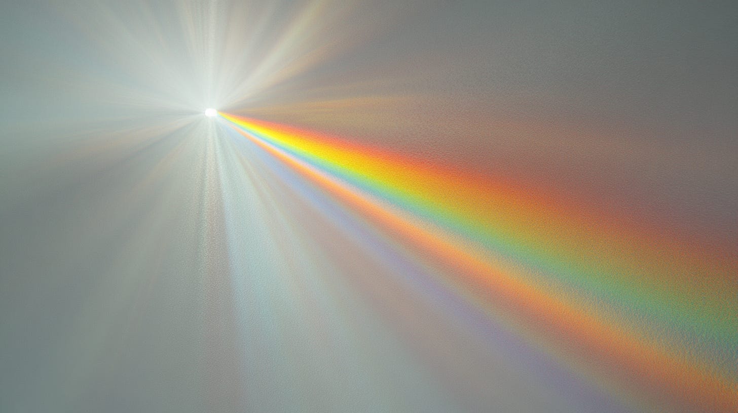 Imagine pure white light—unified, whole, containing all possibilities within itself. This light represents the One, the universal energy, the "I am" that mystics speak of. When this light encounters a crystal prism, it doesn't become different lights. Instead, it reveals what was always there: the infinite spectrum of its own nature.